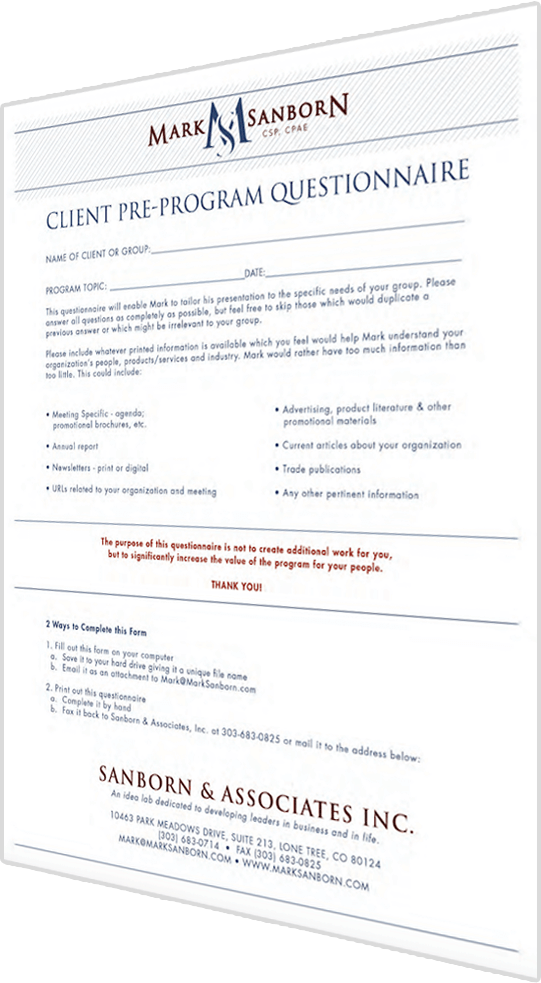 Most professional speakers use a pre-program questionnaire to help them tailor presentations to clients’ needs. The type and amount of information they ask for is a good indication of how well they accomplish that task, so during your selection process, be sure to ask for a copy of the pre-program questionnaire of each speaker under consideration—you can view an example of my questionnaire here.